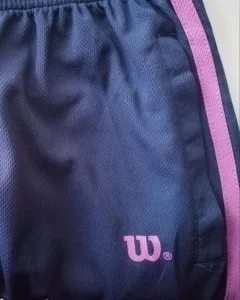 Pants azul marino Wilson. Pants color azul marino con franjas color lila a los lados, talla 30. Tiene bolsas a los lados, en la parte de arriba tiene resorte lo de abajo esta suelo. Es muy cómodo y fresco.