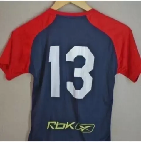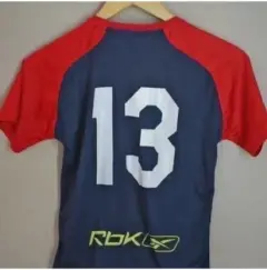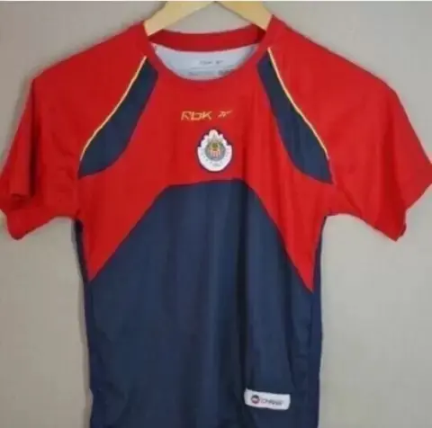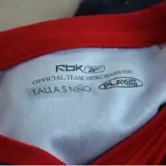 Playera azul y roja del Guadalajara trae logotipo al frente en el centro. Es para Niño, manga corta. Checar fotos 2 y 3 para detalles La tela está un poco desgastada de abajoTiene número 13 en la espalda, Marca Reebok, talla S pieza losNúmeros de atrás están un pocoDesgastados.