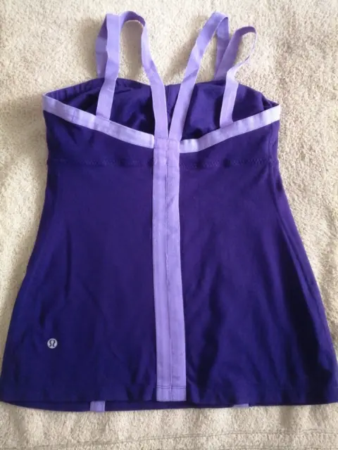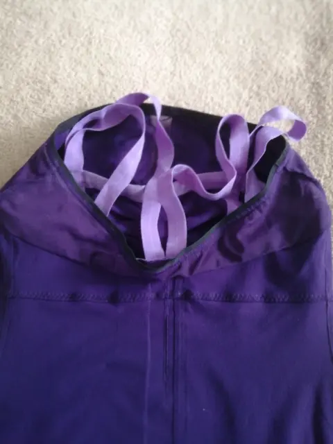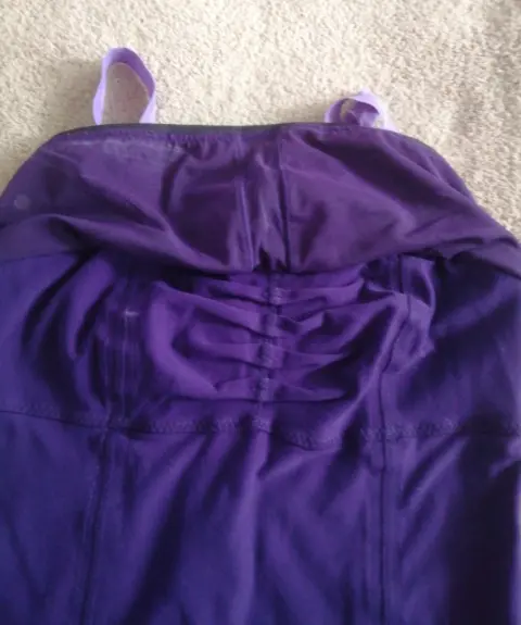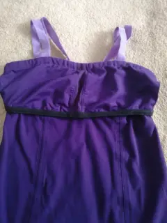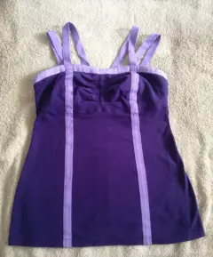 Playera deportiva, tono morado, con tiras gruesas, tela Spandex, axila 37 cms., cintura 36 cms. largo sin tirantes 46 cms.