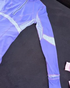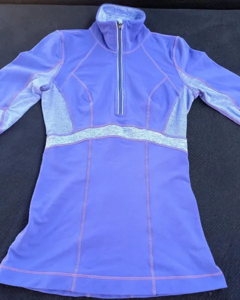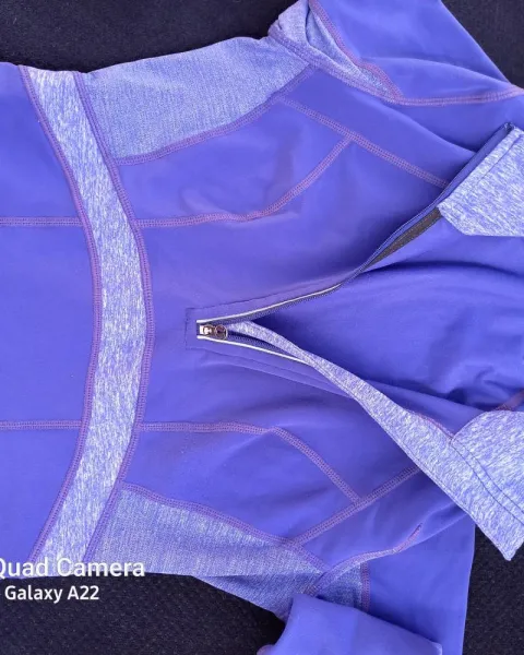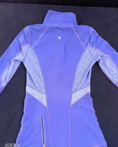 Sudadera deportiva marca lululemon usada en perfecto estado,semi gruesa y a la vez ligera.color morado,con semi cremallera y oyo para los pulgares o cubierta tipo guante talla s/m