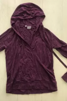 Sudadera morada. Sudadera morada con gorro y cordones al frente, el estilo es cruzado viene abierto, la tela es algodon suave al tacto y es ligera, estira.Medidas:Hombro a hombro: 52 cmAxila a axila: 64 cmLargo: 73 cm