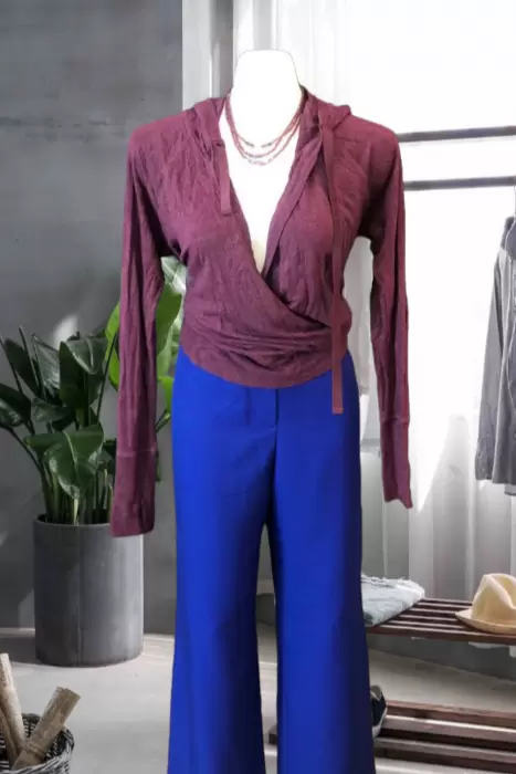 Sudadera morada con gorro y cordones al frente, el estilo es cruzado viene abierto, la tela es algodon suave al tacto y es ligera, estira.Medidas:Hombro a hombro: 52 cmAxila a axila: 64 cmLargo: 73 cm