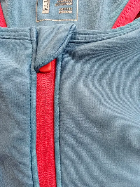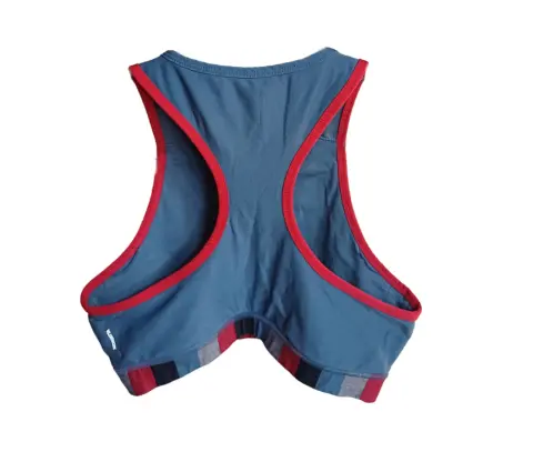 Top Deportivo Azul. Top color azul marino con orillas color rojo, y una tita en la parte inferior de colores azul, gris, rojo y negro, tiene un cierre rojo pequeño en la parte frontal.