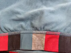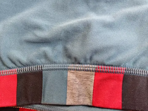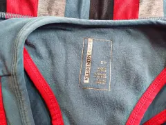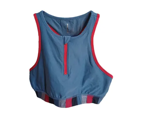 Top color azul marino con orillas color rojo, y una tita en la parte inferior de colores azul, gris, rojo y negro, tiene un cierre rojo pequeño en la parte frontal.
