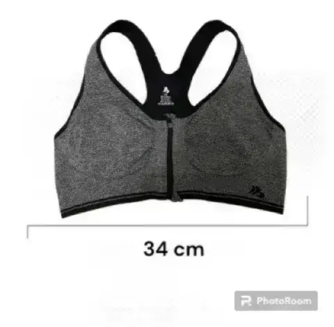 Bonito top deportivo gris con detalles en negro, cierre delantero espalda cruzadaLa talla viene reducida aunque es 2XL viene siendo una talla M