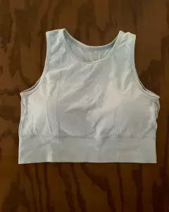Top deportivo con copas color azul cielo, súper cómodo y con corte halter. Transparencia en la espalda. Dice talla M pero queda también a S.