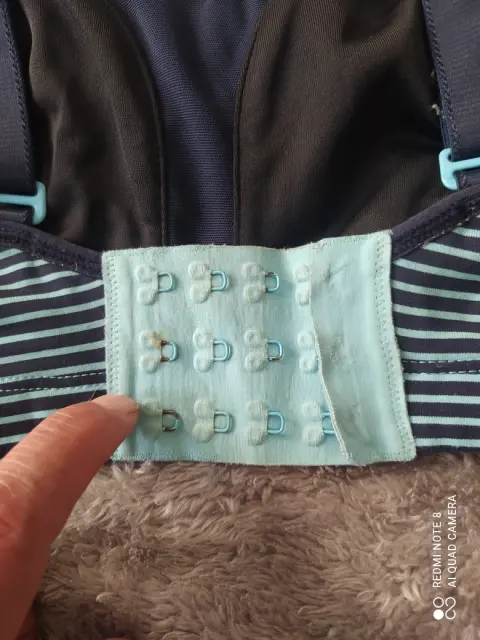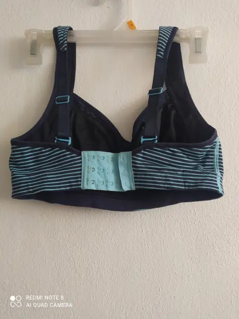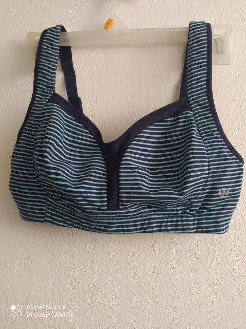 Bonito top deportivo color azul de rayas, no tiene las almohadillas, poco desgaste en broches, talla 6/ S , en buen estado.
