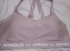 Top deportivo Under Amour. Top deportivo Under Amour color rosa claro, tiene almohadillas internas que se pueden retirar si así lo deseas. Mide de elástico 40cm. llega a estirar 53cm. Material 88% poliéster, 12% elastano.