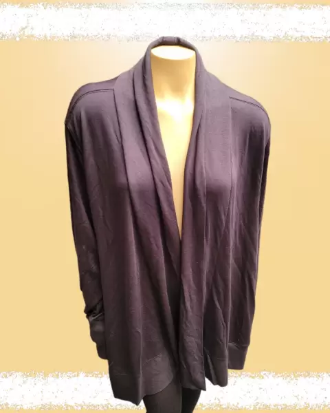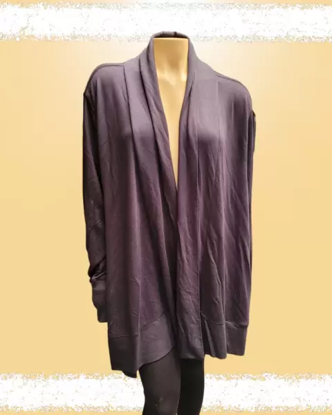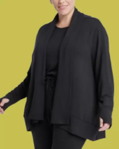 Cárdigan de estilo elegante All in Motion, talla grande 2XL, color negro, tela de felpa francesa con una sensación ligera, ajuste holgado y frente abierto, bolsillos laterales, hechos de mezcla modal y spandex, medidas: 19 "hombro con hombro, manga larga de 27" y 29 "de hombro hacia abajo, nuevo con etiqueta en buen estado.