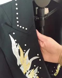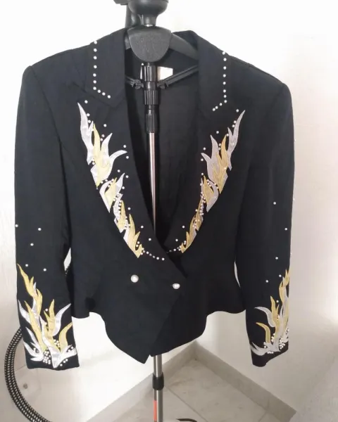 Blazer azul marino con detalles dorados. Blazer azul marino muy obscuro casi negro , no tiene talla sin embargo queda a talla S , super bonito
