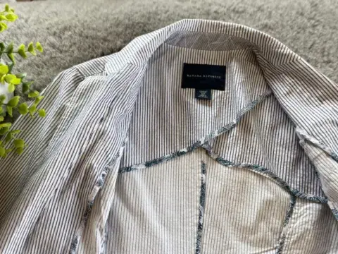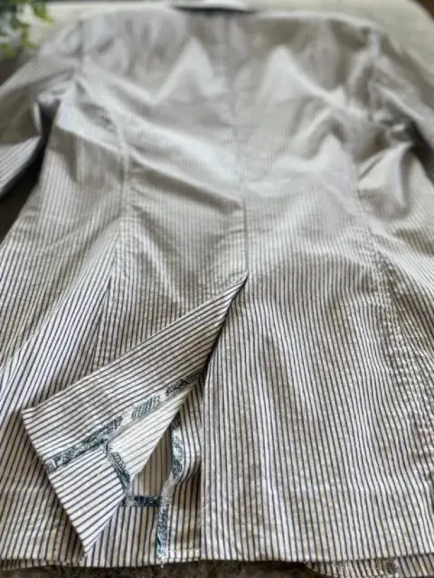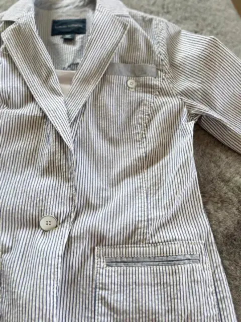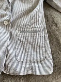 Hermoso saco blanco con rayas azules, es de una tela no tan gruesa. Lo puedes combinar con jeans. Con bolsas laterales. En perfectas condiciones. Talla 4 Petite.Largo: 64 cm.Ancho:45 cmSisa: 20 cmManga: 60 cm