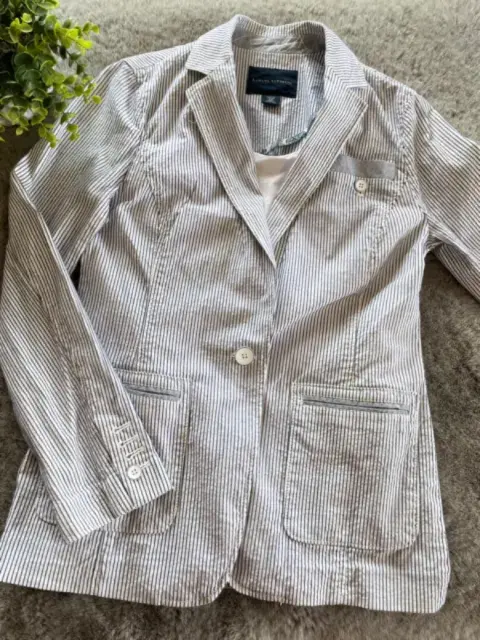 Blazer blanco con rayas azules. Hermoso saco blanco con rayas azules, es de una tela no tan gruesa. Lo puedes combinar con jeans. Con bolsas laterales. En perfectas condiciones. Talla 4 Petite.Largo: 64 cm.Ancho:45 cmSisa: 20 cmManga: 60 cm