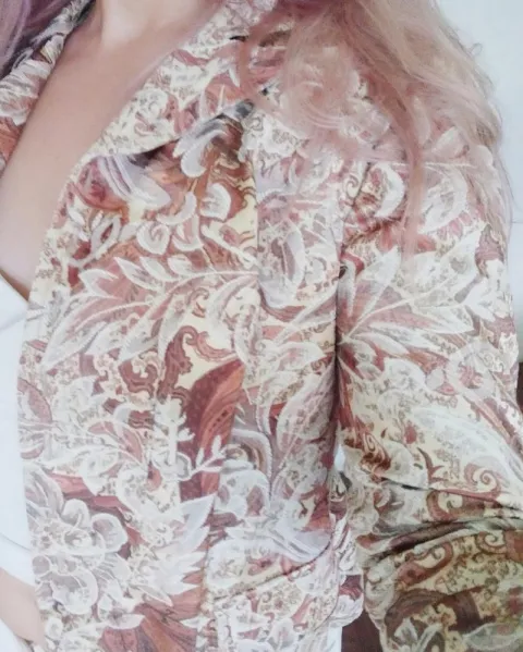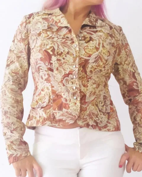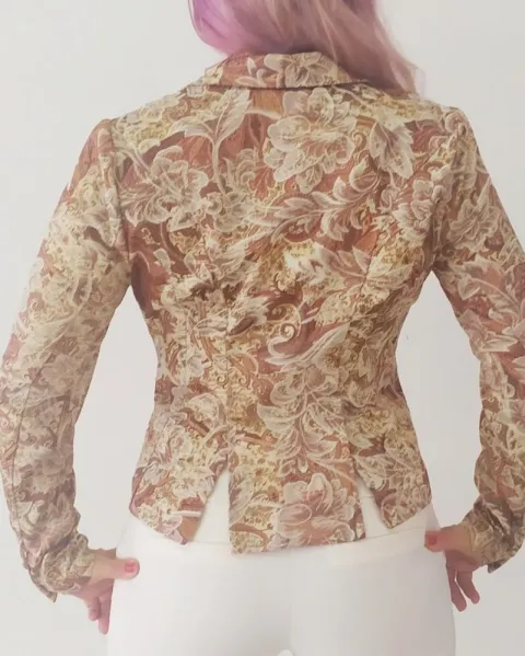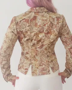 Blazee brocado en tonos beige y dorado, ajustado en la cinturaAncho de hombros 38 cmLargo de manga sesde hombro 60Largo total desde hombro 54