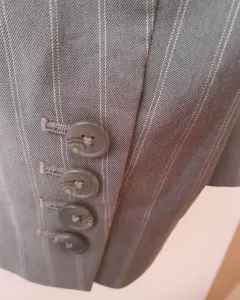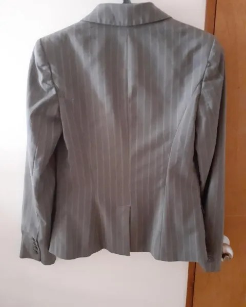 Lindo blazer, color gris a rayas. Talla S. Medidas: hombro- hombro 36 cm, axila-axila 42 cm y largo 57 cm. Está en buen estado.