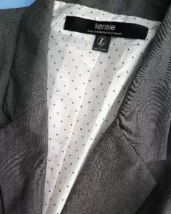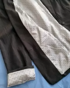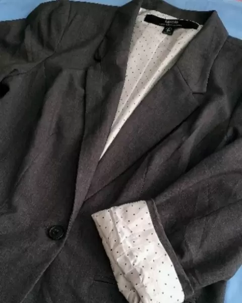 Blazer color gris oscuro con fondo blanco y puntos negros que puede usarse con las mangas dobladas y luce muy bonito😍 doble solapa, un botón y bolsas falsas. Es nuevo, no me quedó por eso lo vendo, talla L.