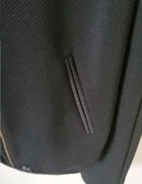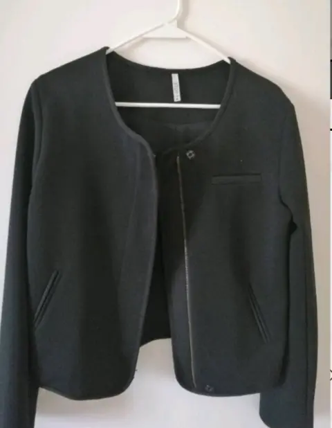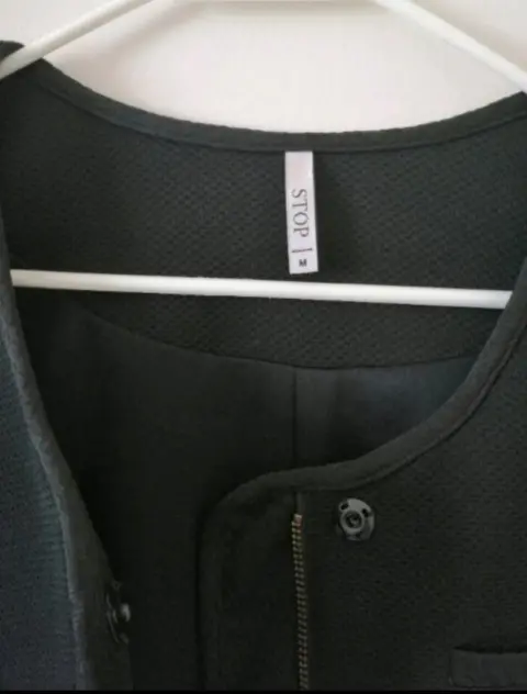 Blazer negro con textura, es corto y da apariencia de chamarra negro, detalles en el contorno de as bolsas, se abrocha con cierre
