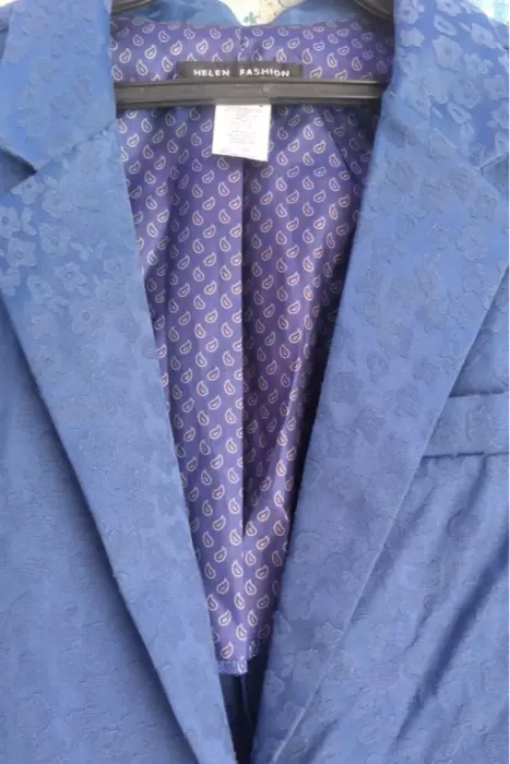 Blazer corto de mangas 3/4 color azul, con textura de flore, luce bien a la figura