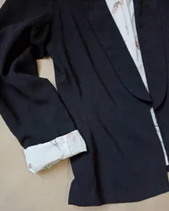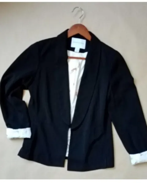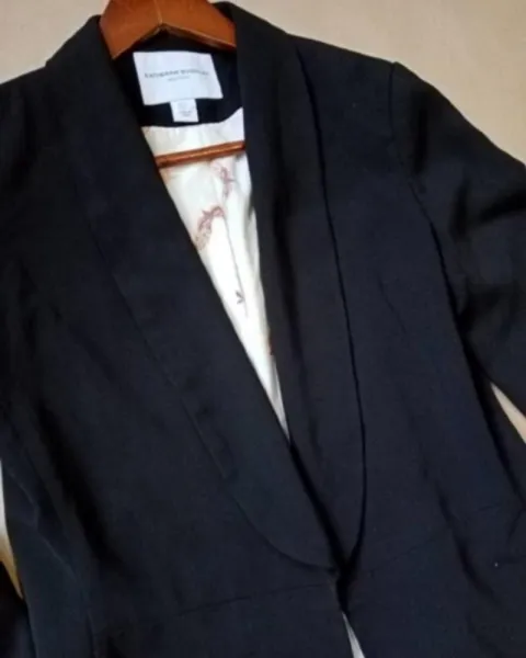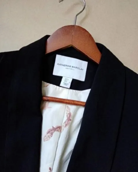 La tela! La estructura, el forro... Es para enamorarte, la solapa que tiene da un toque especial, es PERFECTO! Talla SMarca Katherine Barclay. Le hace falta tintorería pero está en excelentes condiciones.