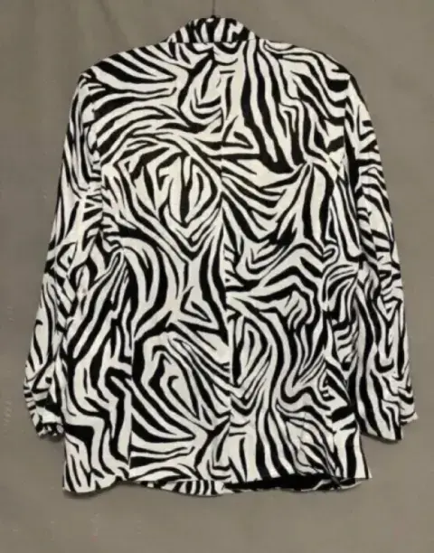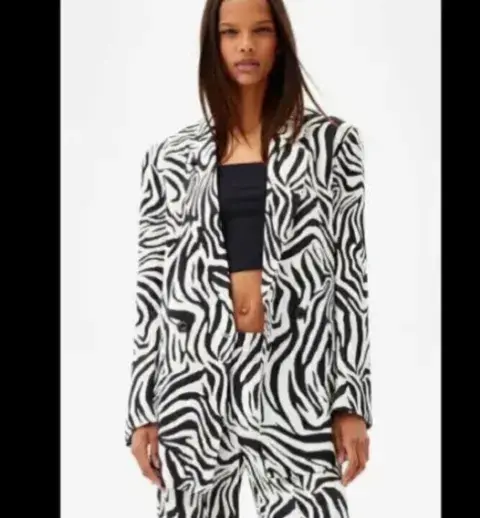 Blazer con estampado de zebra. El blazer tiene una mancha en la espalda, se puede ver en la última foto. Se llevó a tintorería pero no se le pudo quitar. Hombro 45 cm, axila a axila 53 cm, manga 62 cm, largo 77 cm