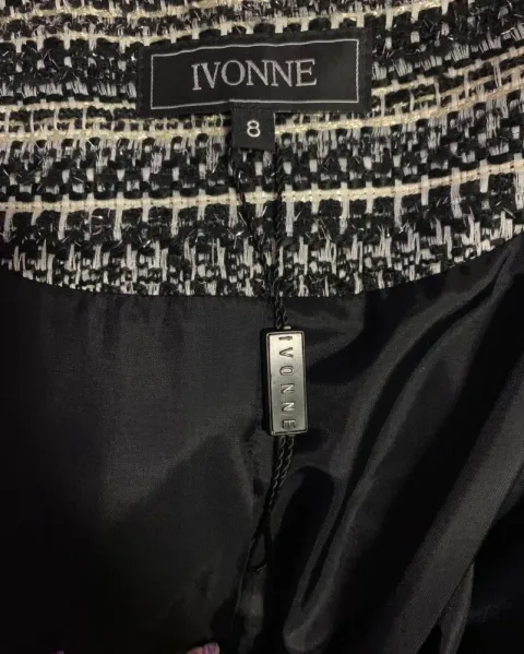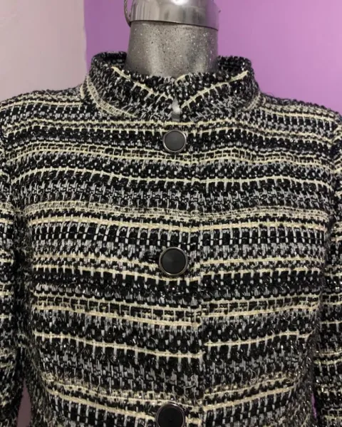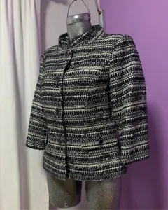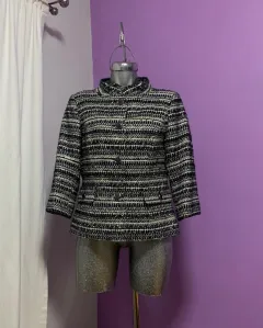 Precioso saco corto, manga 3/4 e hilo metalizado, en cuello redondo. Es marca IVONNE, talla 8. Va bien a una chica/mediana.Sus medidas son: 58cm de largo, 46cm de manga y 46cm de axila a axila.