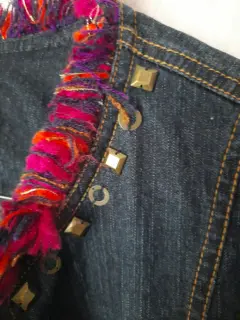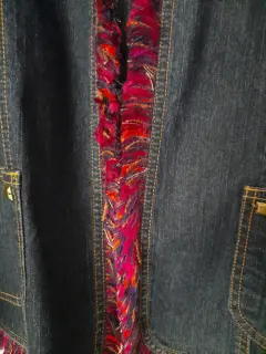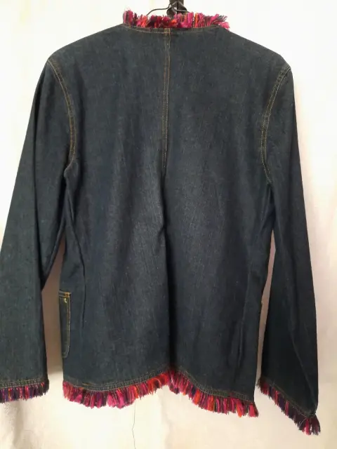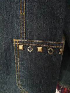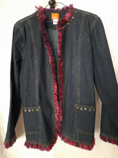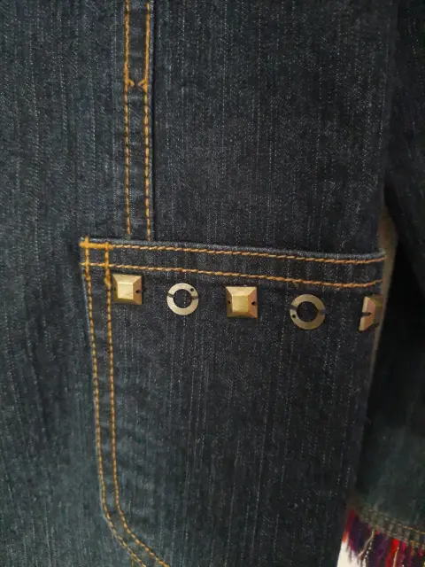 Blazer de mezclilla talla 12 con vivos al frente y mangas color rosa y azul y estoperoles en cuello y bolsas.