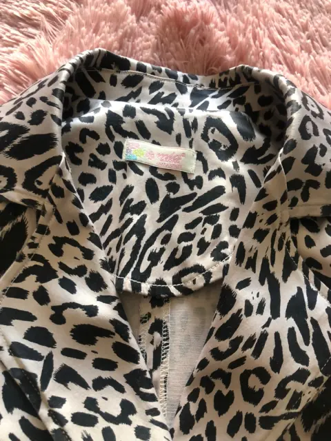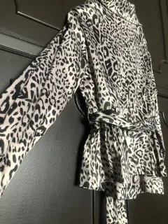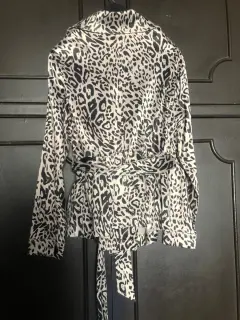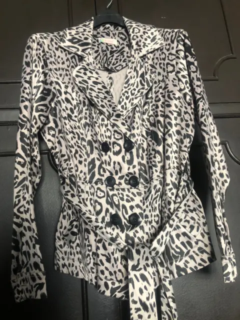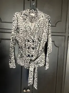 Blazer estilo animal print. Hermoso blazer con cinturón y botonadura al frente de 8 botones, tiene solapa y cinto, no tiene forro, cuenta con dos bolsas al frente y es de una tela de satín gruesa. Medidas de axila a axila 54cm, cintura 49cm, largo manga 61cm, largo blazer 64cm