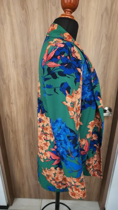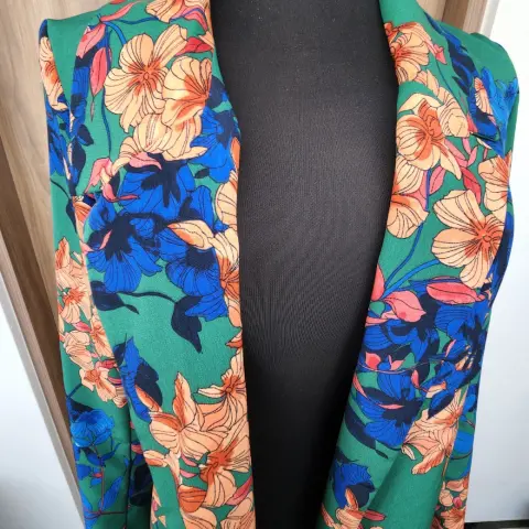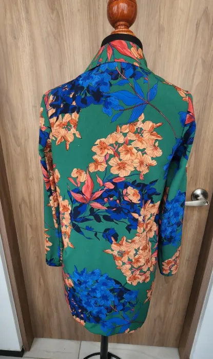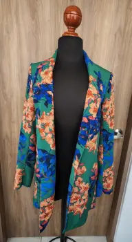 Hermoso blazer color verde esmeralda, las flores vienen en tonalidad azul,amarilla y roja.La tela es fresca y se encuentra en excelente estado.