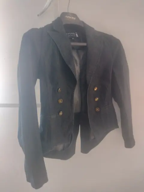 Blazer corto Ivonne Petite tela delgada tipo mezclilla strech color negro en talla 6 ideal para el closet que combina con todo, un estilo que nunca pasa de moda, clásico y cómodo en todo momento. No tiene ningún detalle de desgaste fue usado solo como exhibición por eso perdió la etiqueta los botones dorados le dan una vista perfecta, la tela delgada te permite el uso sin acalorarte y te da el aspecto de formalidad en cualquier evento. Acepto ofertas que no castiguen tanto el precio