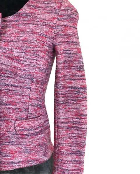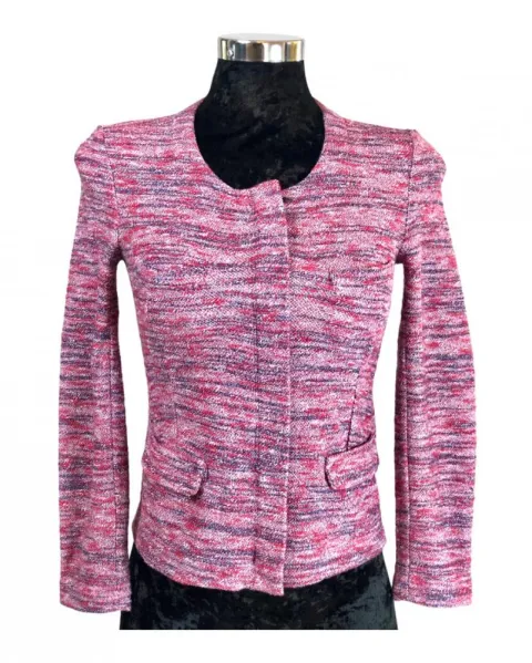 Blazer en tela color rosa y detalles en rojo, tiene cierre al frente y cuello redondo es talla XS marca J.Crew.