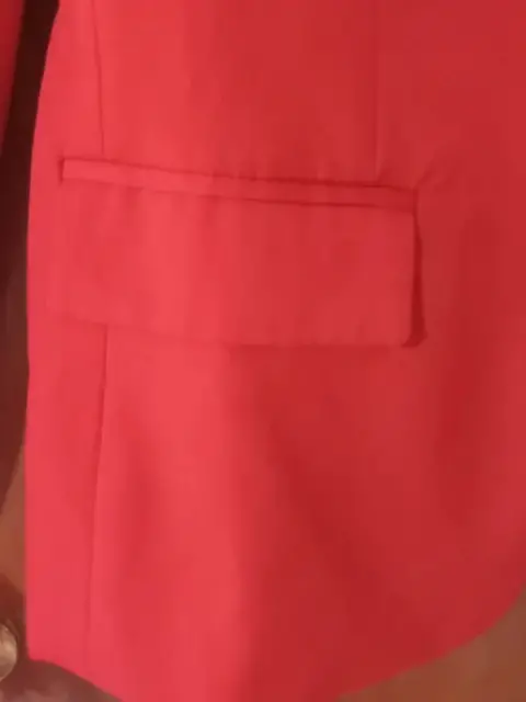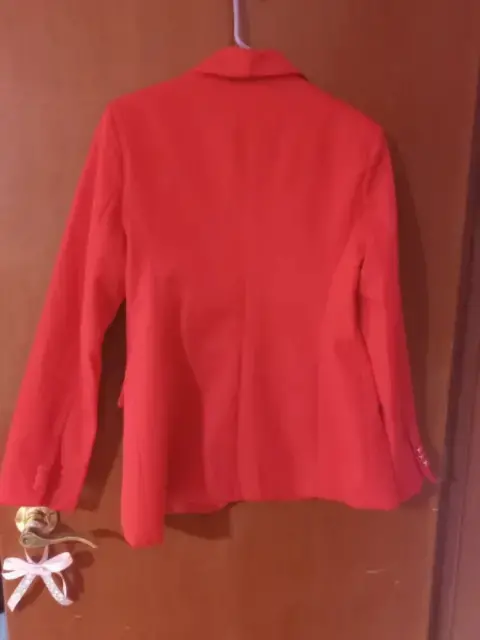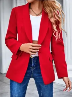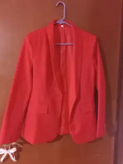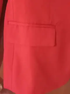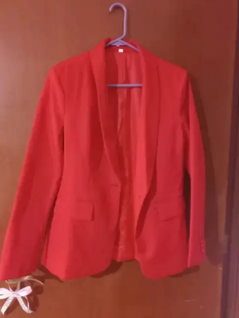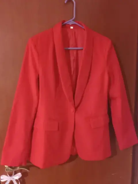 Blazer largo rojo. Blazer largo, manga larga, color rojo, con forro, 3botones rojos de tela en cada puño, se cierra con un botón rojo de tela, tiene dos simulaciones de bolsas y a cada costado, las medidas son: hombro a hombro 40cm, axila a axila 45cm, largo de manga 62cm y largo de blazer 67cm, la tela no estira