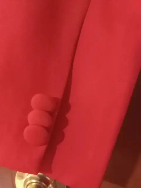 Blazer largo, manga larga, color rojo, con forro, 3botones rojos de tela en cada puño, se cierra con un botón rojo de tela, tiene dos simulaciones de bolsas y a cada costado, las medidas son: hombro a hombro 40cm, axila a axila 45cm, largo de manga 62cm y largo de blazer 67cm, la tela no estira
