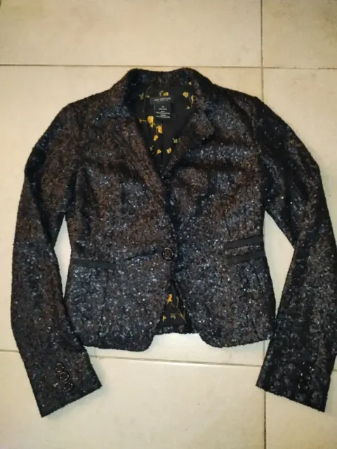 Saco tipo blazer, broche con botón de lentejuela pequeña. Talla XS. Color negro, marca MM COUTURE. Nuevo sin etiqueta