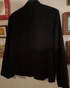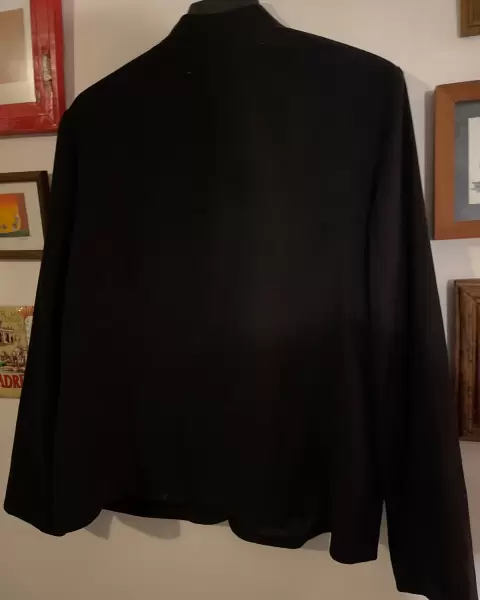 Blazer negro sin solapas, con bolsos fingidos de tres botones, corto.