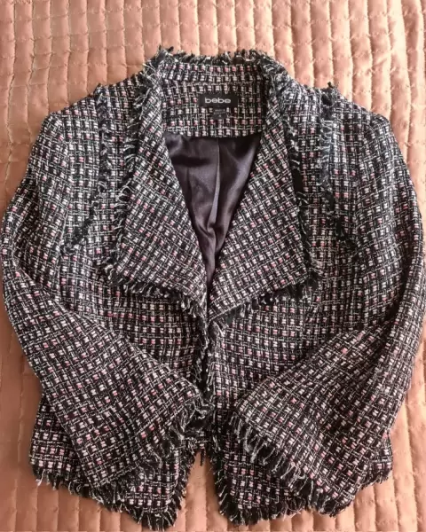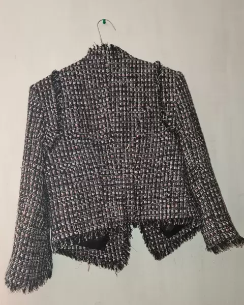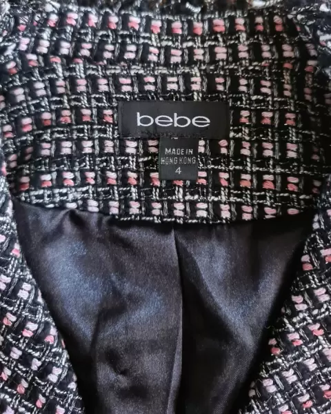 Blazer negro con detalles rosas. Termina en pico y es un saco corto. Talla 4, en perfecto estado.