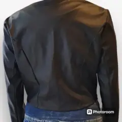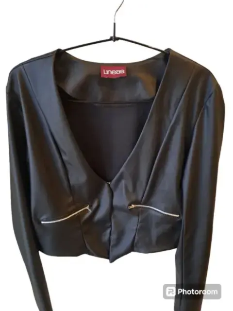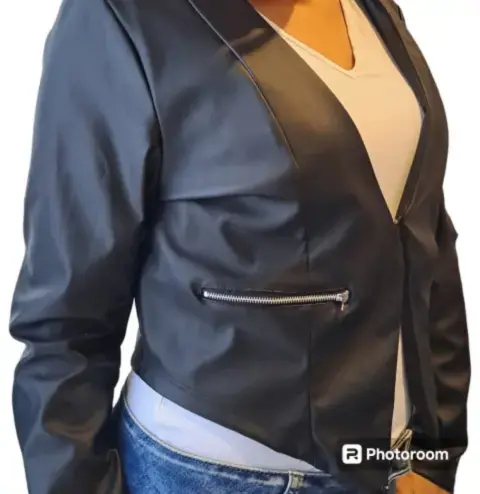 Blazer negro corto. Blazer tipo chamarra negra de vinil por fuera y tela lisa por dentro, como mejora se le añadieron dos broches para permitir cerrar el blazer, mostrados en la foto 3 y 8. Cuenta con dos cierres que aparentan ser dos bolsas pero son fingidas.