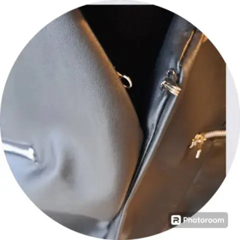 Blazer tipo chamarra negra de vinil por fuera y tela lisa por dentro, como mejora se le añadieron dos broches para permitir cerrar el blazer, mostrados en la foto 3 y 8. Cuenta con dos cierres que aparentan ser dos bolsas pero son fingidas.