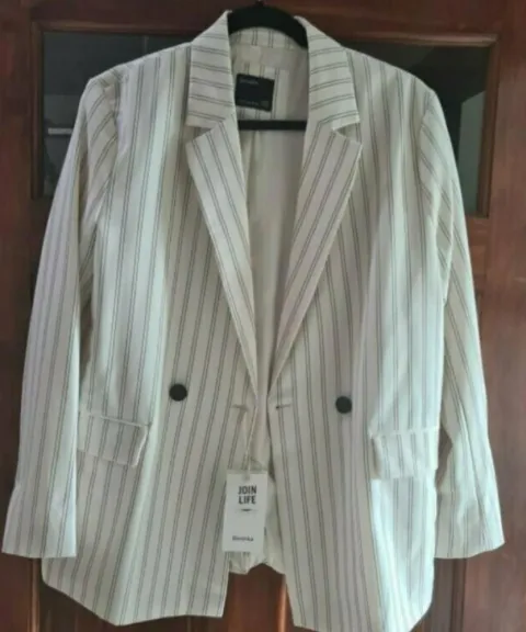 BLAZER NUEVO CON ETIQUETA BERSHKA. Completamente nuevo con etiqueta de 799 pesos, color hueso con líneas negras, talla M...elevado tu oufit.