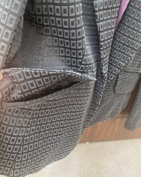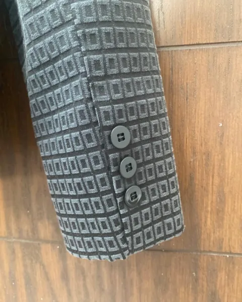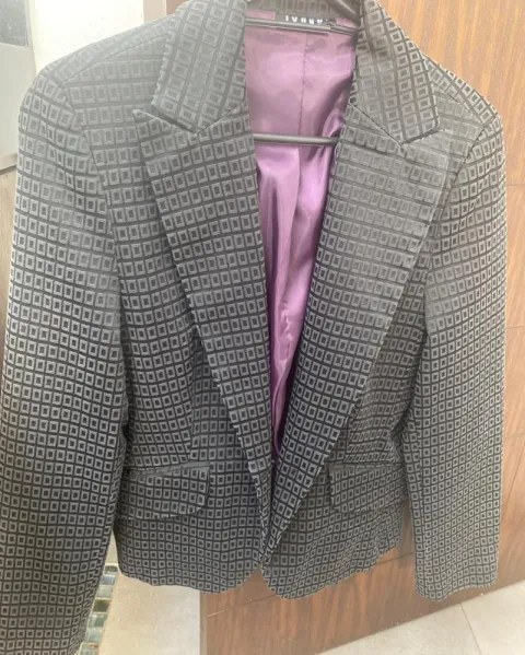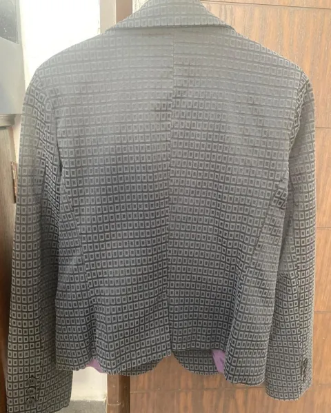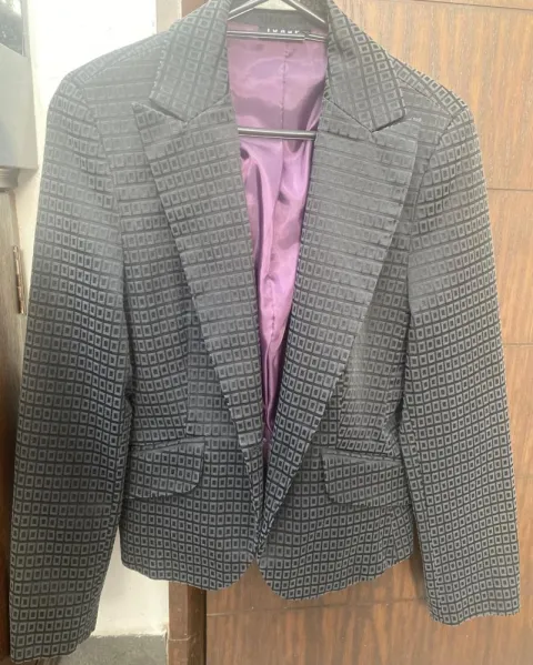Saco elegante a cuadros de color negro con forro morado, talla 6, con bolsas al frente y botones simulados en las mangas, corte frances y cuello en V, de axila a axila 44 cm, largo 58 cm.