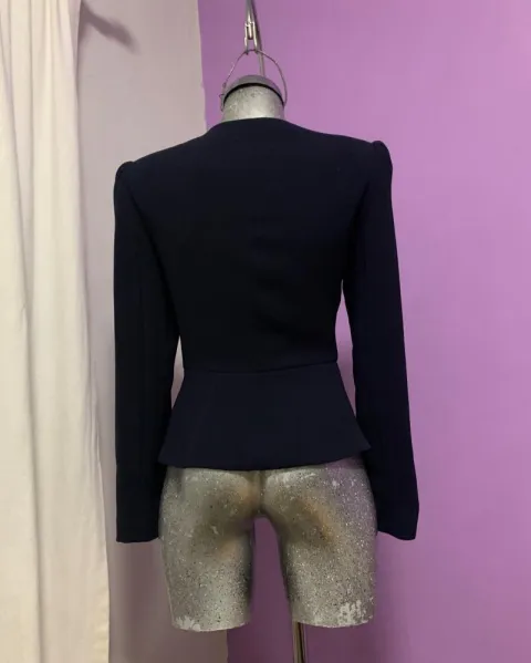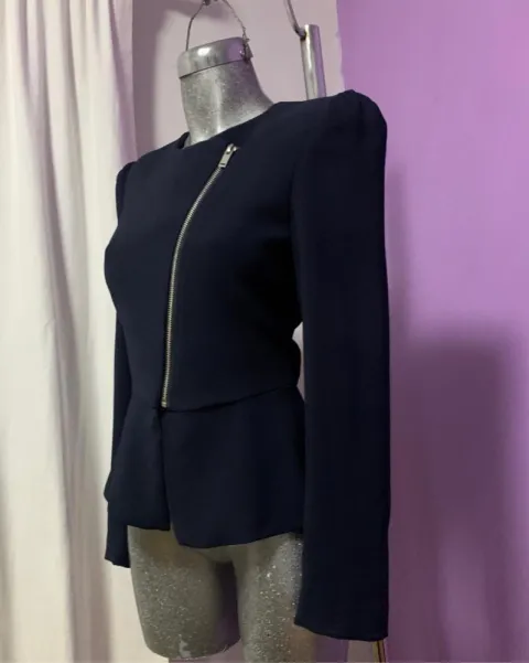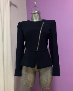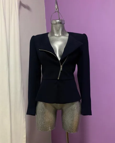 Blazer tipo peplum azul marino. Precioso blazer formal, tipo peplum, color azul marino. Dice que es talla M o 6, pero también le va muy bien a una talla chica. Está nuevo.Sus medidas son: 55cm de largo, 43cm de axila a axila y 60cm de manga