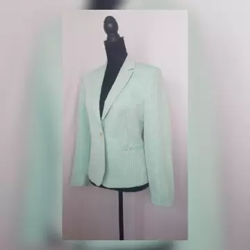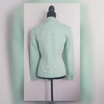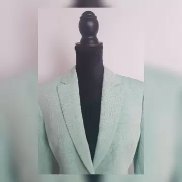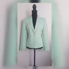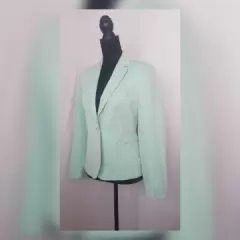 Blazer tradicional color VERDE AQUA, cuello clásico c/solapas muesca, cierre p/botonadura, 2 bolsos vivo, manga larga terminada en botonadura y forro interior. Talla 10. Dimensiones cms: 42 hombro, 52 axila, 44 cintura, 55 zona baja, 60 largo, 60 largo manga. 52% lino, 48% algodón. P/lavado en seco.