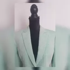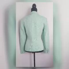 Blazer Tradicional en Lino. Blazer tradicional color VERDE AQUA, cuello clásico c/solapas muesca, cierre p/botonadura, 2 bolsos vivo, manga larga terminada en botonadura y forro interior. Talla 10. Dimensiones cms: 42 hombro, 52 axila, 44 cintura, 55 zona baja, 60 largo, 60 largo manga. 52% lino, 48% algodón. P/lavado en seco.