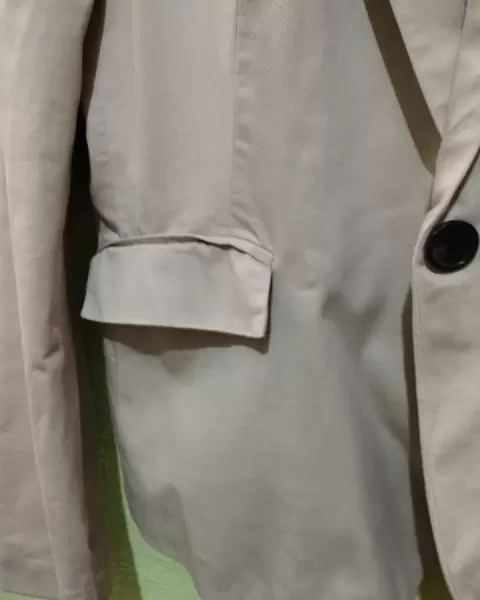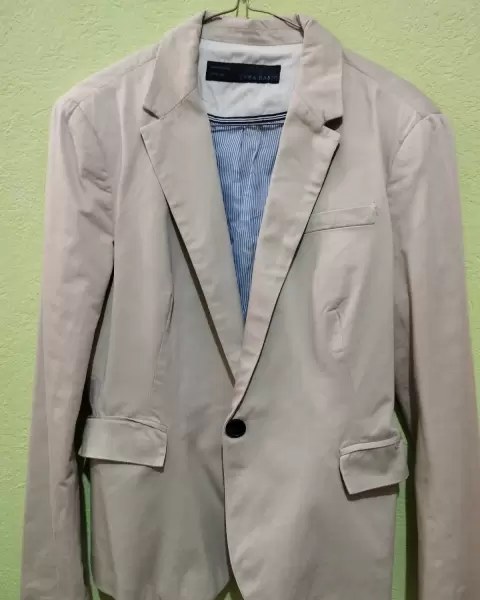 Blazer Zara Basic beige. Blazer beige con fondo en tela tipo satín color azul con blanco, bolsas en buenas condiciones.