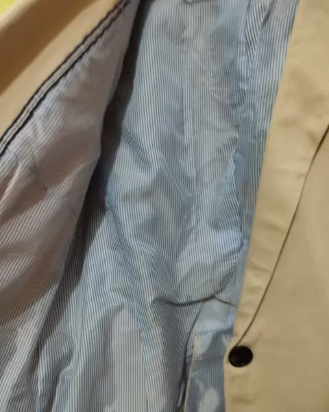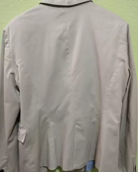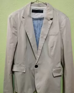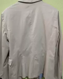 Blazer beige con fondo en tela tipo satín color azul con blanco, bolsas en buenas condiciones.