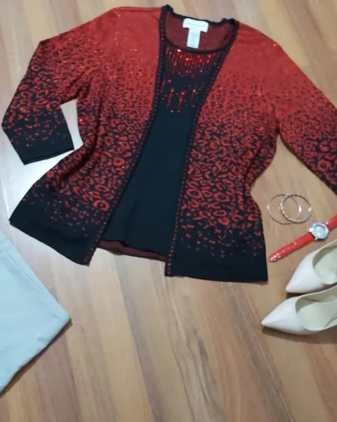 Sueter con blusa y detalle de pedrería en el frente. Sueter pegado a la blusa, simula ser un blazer con su blusa, color rojo con negro. Con esta prenda en poco tiempo ya estarás lista para salir 😉