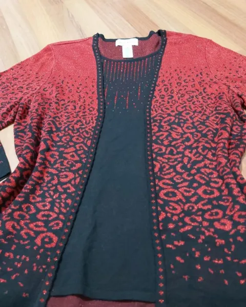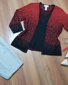 Blusa-Sueter NUEVO. Sueter con blusa y detalle de pedrería en el frente. Sueter pegado a la blusa, simula ser un blazer con su blusa, color rojo con negro. Con esta prenda en poco tiempo ya estarás lista para salir 😉