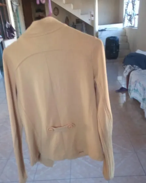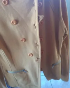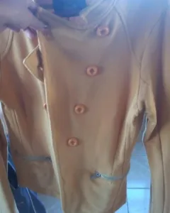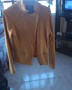 Es un bonito saco entre color café claro y naranja, se ve super lindo, dice talla M, pero también queda bien a una S, único detalle de uso...