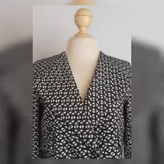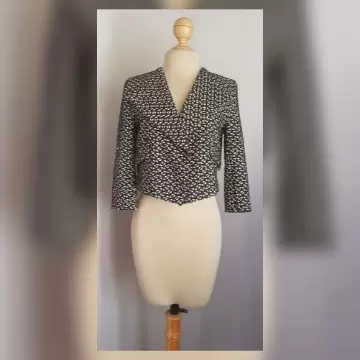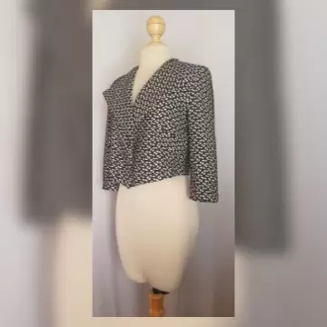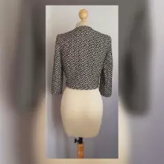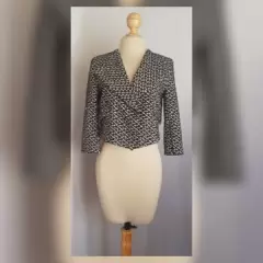 Chaqueta cropped c/estampado bitono BLANCO LINO/NEGRO ÉBANO, cuello clásico c/solapas, sin sistema de cierre, manga 3/4, 2 bolsos simulados vivo c/tapeta y forro interior. Talla M. Dimensiones cms: 39 hombro, 52 axila, 53 zona baja, 51 largo, 45 manga. 58% poliéster, 39% algodón, 3% elastano. Para lavado en casa.***HECHO EN ITALIA***
