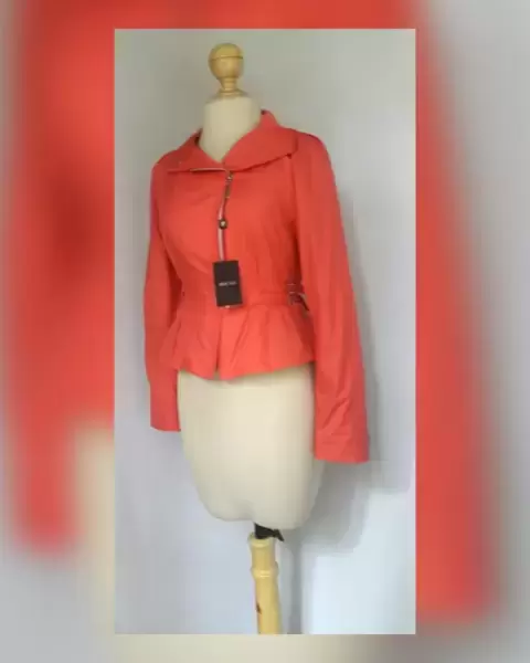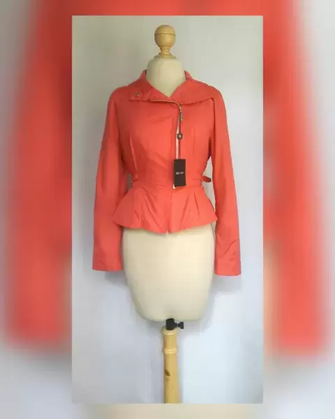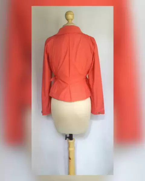 Chaqueta estilo Peplum. Chaqueta peplum tono CORAL KALANCHOE, ultraligera, cuello clásico c/solapas convertible a cuello alzado c/cárdigan y snaps, cierre p/cremallera, manga larga semi abullonada terminada en tira regulable c/snap, doble tira c/hebilla en cintura p/mejor ajuste y forro interior. Talla 32. Dimens cms: 38.5 hombro, 50.5 axila, 45 cintura (regulable), 57 zona baja, 55 largo, 60.5 largo manga. 100% poliéster.