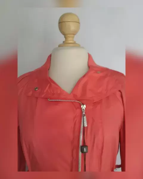 Chaqueta peplum tono CORAL KALANCHOE, ultraligera, cuello clásico c/solapas convertible a cuello alzado c/cárdigan y snaps, cierre p/cremallera, manga larga semi abullonada terminada en tira regulable c/snap, doble tira c/hebilla en cintura p/mejor ajuste y forro interior. Talla 32. Dimens cms: 38.5 hombro, 50.5 axila, 45 cintura (regulable), 57 zona baja, 55 largo, 60.5 largo manga. 100% poliéster.