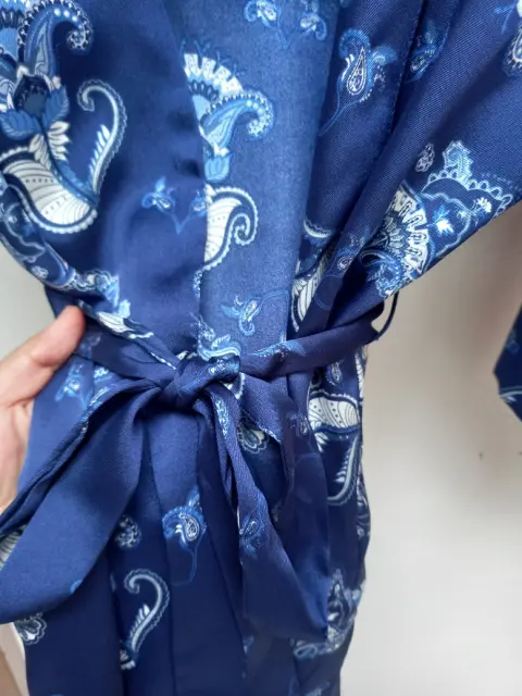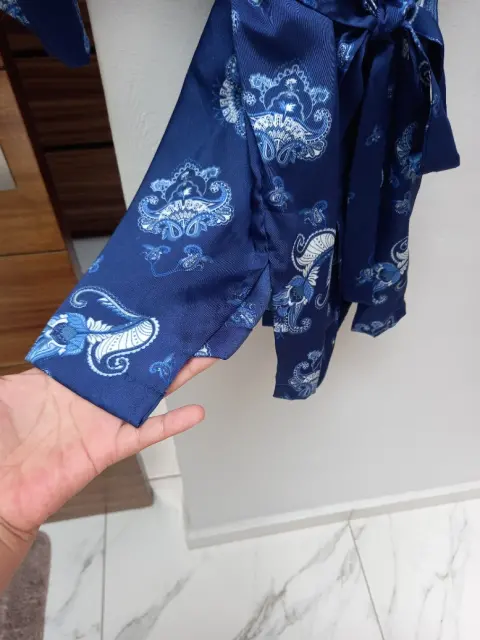 Ensamble con cinturon. Hermoso estampado y color azul combina hermoso con jeans, tela tipo satín, manga 3/4 unitalla queda a s, m, g... hermoso con su fajillo
